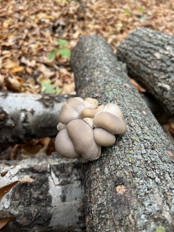 A new venture happening in this woodland is fungi farming. One of our garden staff members, Laura Behr, started this project in early April 2025 by inoculating cut logs with plugs filled with mushroom spores. Two types of edible fungi were planted, Nameko and PoHu oyster mushrooms. These types of fungi grow well on dead and rotting wood, so we used some box elder, beech and willow logs that had just been cut. These logs were drilled and then filled with fungi plugs, which were pounded in to fit snugly. Wax was coated over each plugged hole to ensure the young fungal spores were protected from the lakeside elements, giving them time to spread throughout the logs. Over the next two years, we will hopefully see some mushrooms growing from our stacks of logs along the Bear Path.